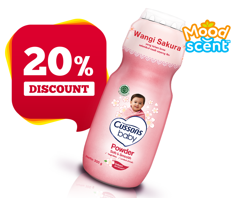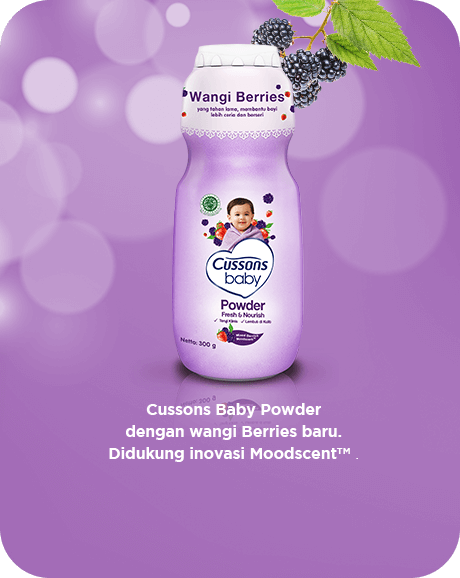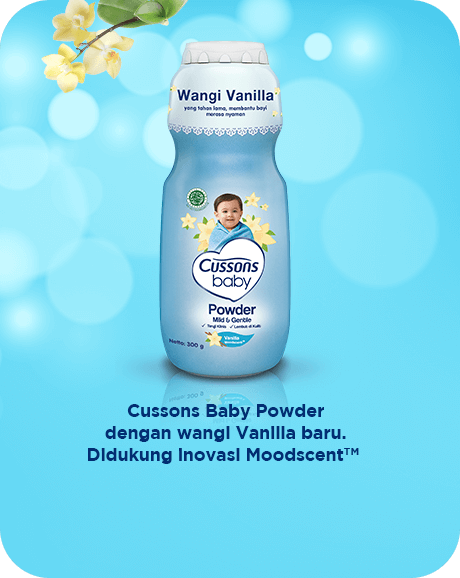Cussons Baby Powder dengan wangi baru. Didukung inovasi Moodscentâ„¢ yang membantu membuat mood bayi menjadi lebih happy.