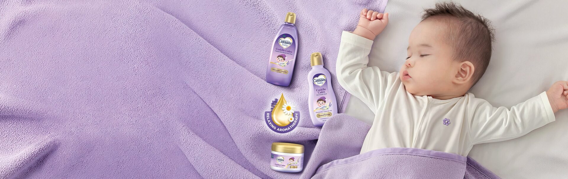 Cussons Baby Cuddle Calm dirancang secara khusus dengan AromaTherapy Essential Oil, Chamomile + Lavender Oil. Melindungi secara alami, sekaligus bantu si Kecil rileks, mudah terlelap, dan tidur nyenyak.